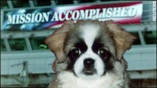 Before you click on the link below, one warning: what you're about to see you may find either hypnotic or nauseating. Perhaps both at once. It would probably go well with drugs and Brian Eno, so cue those up if you got 'em. Enjoy. 22 January 2004![]() Thank you all very much...My fellow Americans: Major combat operations in Blog have ended. In the battle of Blog, FLOG™ and our allies have prevailed. (Applause.) And now our coalition is engaged in securing and reconstructing that blog...The tyrant has fallen, and Blog is free... ...Operation Shock and Awwww! was carried out with a combination of precision and speed and boldness the enemy did not expect, and the world had not seen before. From distant wallpaper databases or pet-owner's websites, we sent puppies and marmots that could destroy an entire enemy post... ... Our war against cute little critterism is proceeding according to principles that I have made clear to all: Any person involved in committing or planning cute puppy, penguin, or other attacks against FLOG™ becomes an enemy of FLOG™, and a target of FLOG™ justice. (Applause.) Any person, organization, or government that supports, protects, or harbors cute little critterists is complicit in the cheering up of the innocent, and equally guilty of cute little crimes. Any outlaw blog that has ties to cute little critterist groups and seeks or possesses weapons of mass disarming cuteness is a grave danger to the civilized world -- and will be confronted. (Applause.) And anyone in the world, including the pet-obsessed world, who works and sacrifices for freedom from attacks of cute wittle puppy doggies--oh, they so cute! Yes they are! Yes they are!--has a loyal friend in FLOG™. (Applause.)... ...May God bless you all, and may God continue to bless FLOG™. (Applause.) 21 January 2004In Defense of the War Effort.